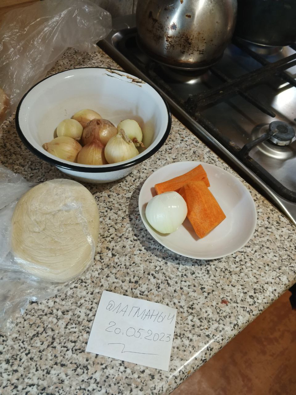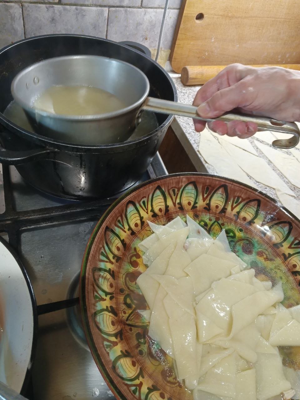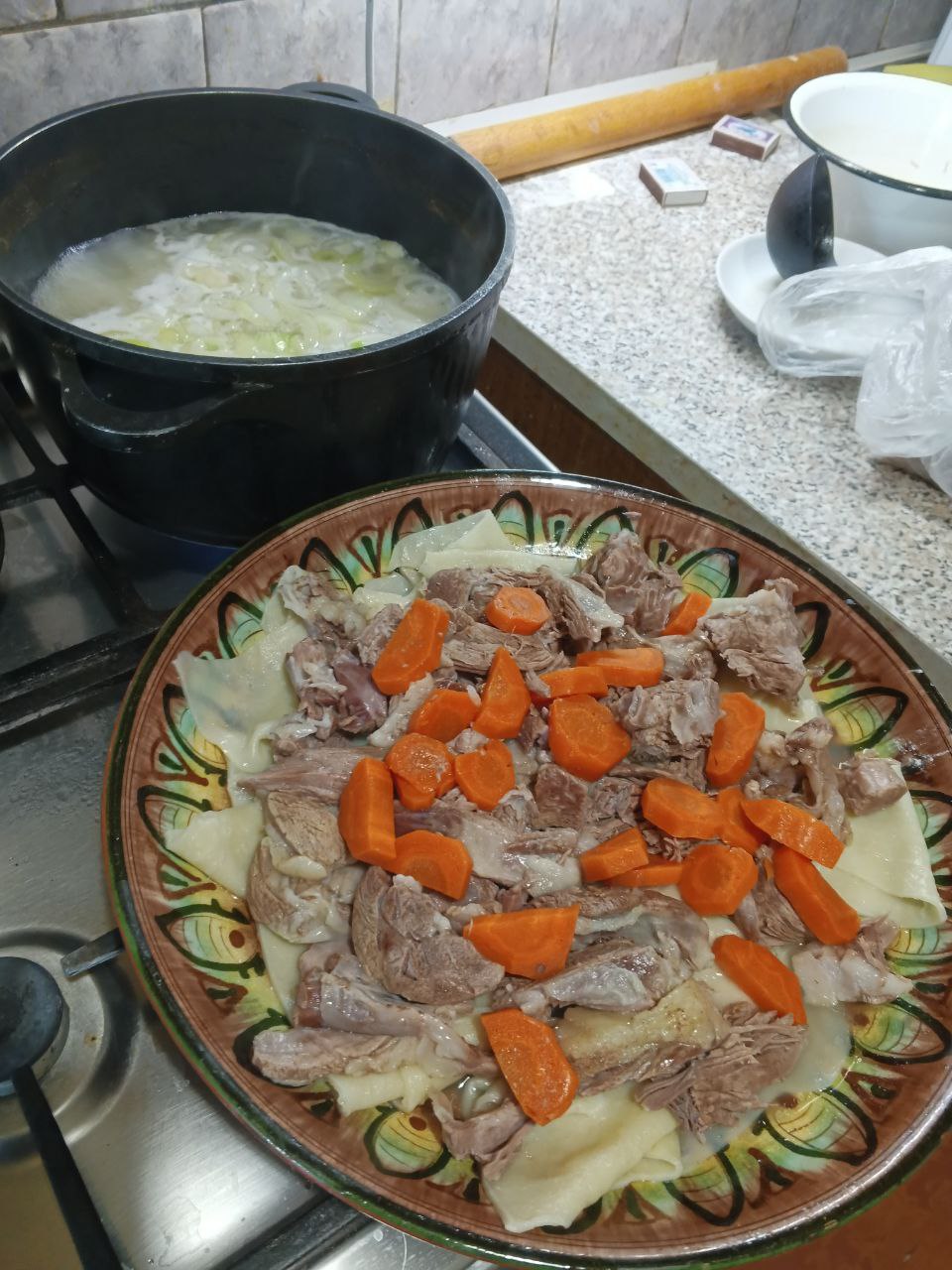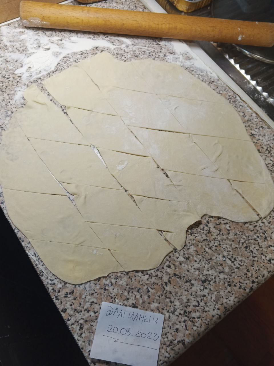 В конце приготовления бульона маманя раскатала тесто, оставалось от ХАНУМА , в морозильнике лежало, нарезала на ромбы.