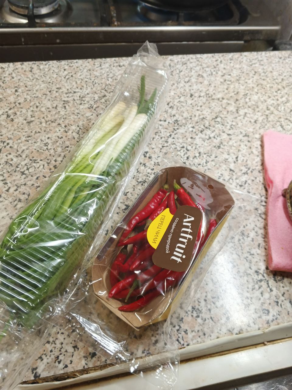 Нарезаем мелко зелёный лук и посыпаем сверху