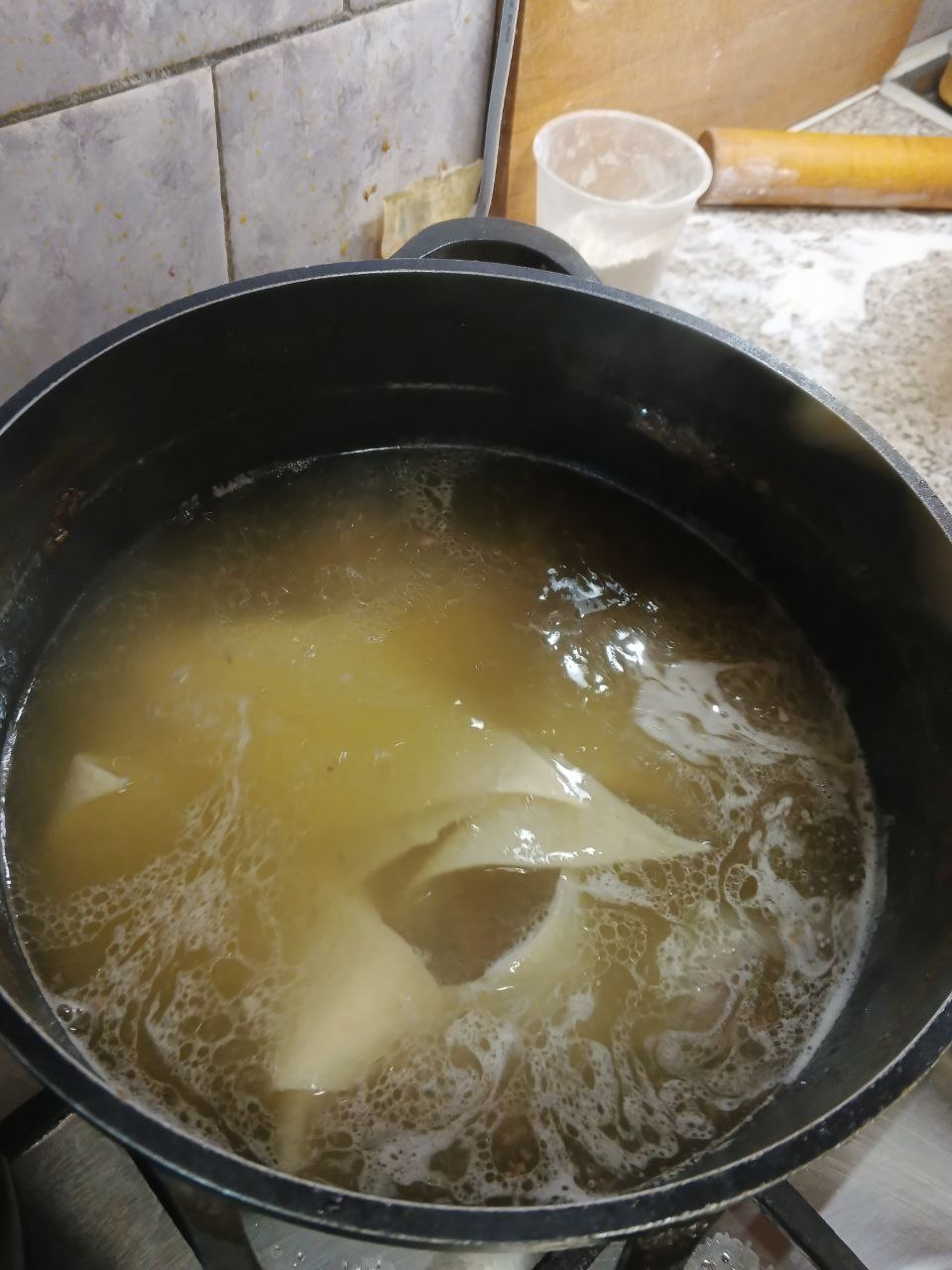 В оставшияся кипяший бульон закидываем ромбами нарезанное тесто (можно отлить в отдельную посуду, для подачи с готовым блюдом , отдельно бульона) в оставшемся варить тесто.