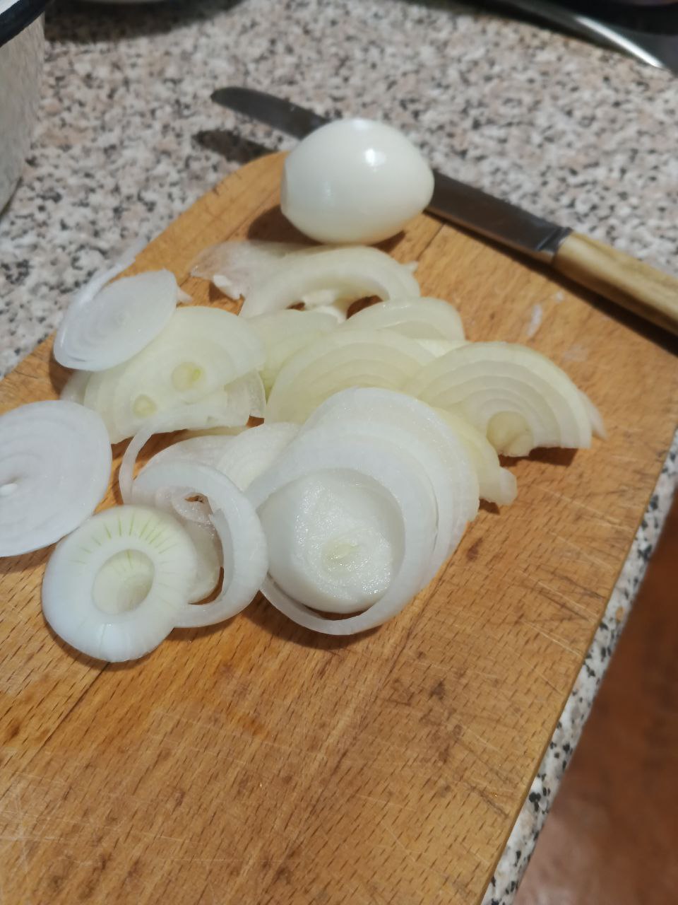 Нарезаем лук полукольцами и закидываем в кипящий бульон на 2-3 минуты