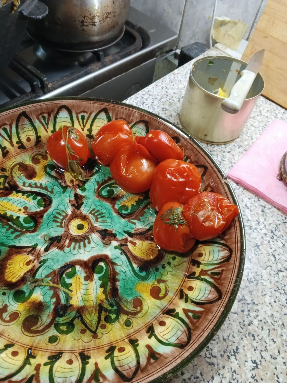 Затем вилкой или ножом делаем дырки в помидорах и выкладываем последним слоем на каппусту и зелень