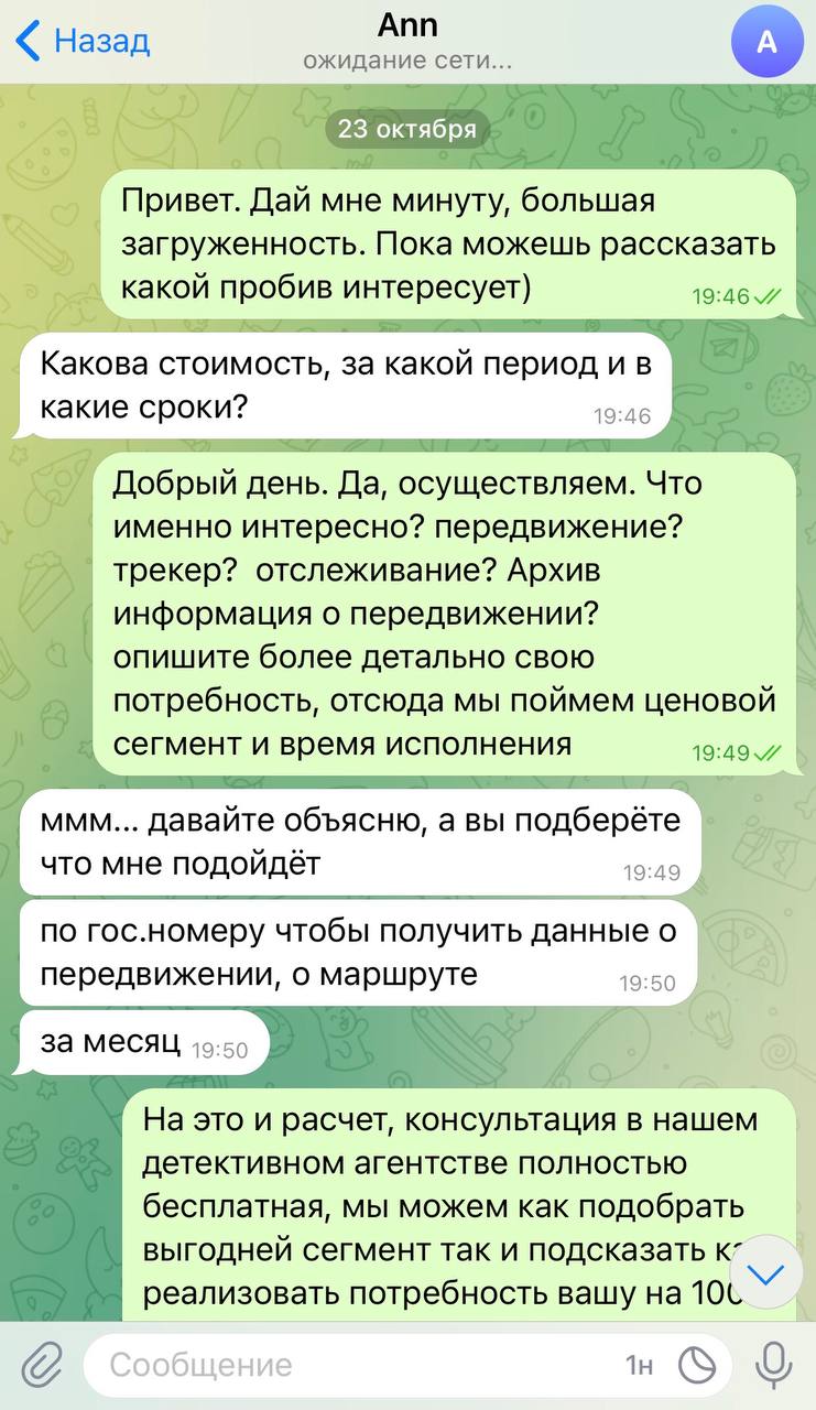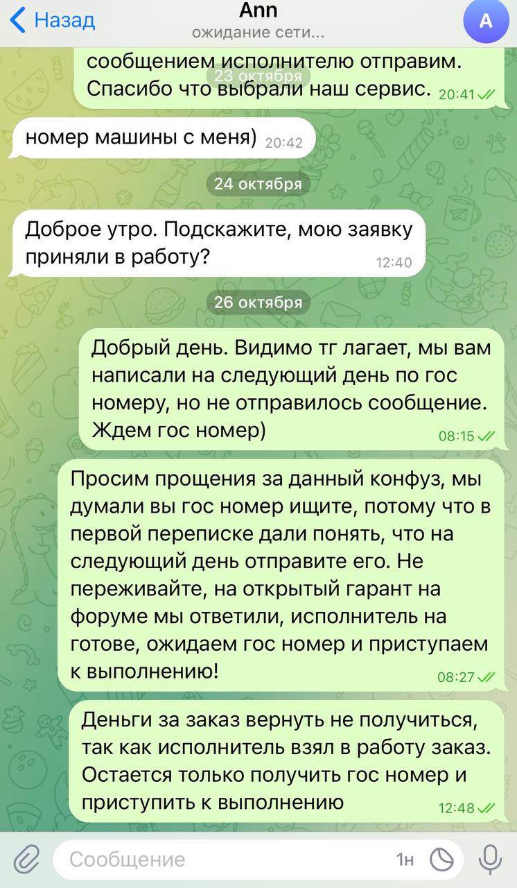 5. Описание претензии: пробив машины по гос.номеру (предоставление данных из архива). После оплаты сделки 23.10.2024г. Продавец перестал отвечать на сообщения и вышел на связь только 26.10.2024г. к этому времени сделка стала не актуальной.