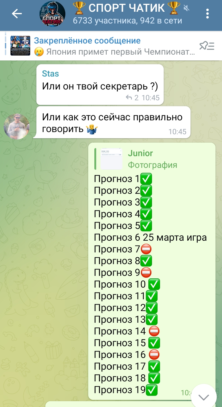 Привет жителям форума, я занимаюсь ставками на спорт, давно , не договорные матчи , не коэффициент 10-20, а хорошая сильная аналитика, которая от начального банка каждый месяц сделает от 50 до 300% к банку при ставке банка 5%( рекомендуемый Начальный банк от 10к до 100к, можно и меньше банк иметь, но раскручиваться дольше надо будет, я не прочь давать прогнозы, тем кто раньше ставил или хочет на этом заработать на долгую перспективу пока я жив и здраво мыслю и сразу скажу без задних мыслей получать свой процент от чистого выйгрыша банка 30%, в минус точно не уйдем , на длинной дистанции , сейчас на одном форуме даю прогнозы и у себя в тг , но там аудитория игроманов ,а в тг мало подписчиков , тут выкладывать Прематч буду, но в ввиду того что бывают Live матчи с очень хорошей проходимостью оставлю свой тг, кто захочет,напишет ,добавлю @Junior_Clab ожидаю разные комментарии от адекватных до непонятных, , по истечению времени недели двух трех ,ожидаю уже отзывы ,которые покажут другим насколько это реально. Моя личка в тг открыта для помощи как ставить , где ставить и сколько.