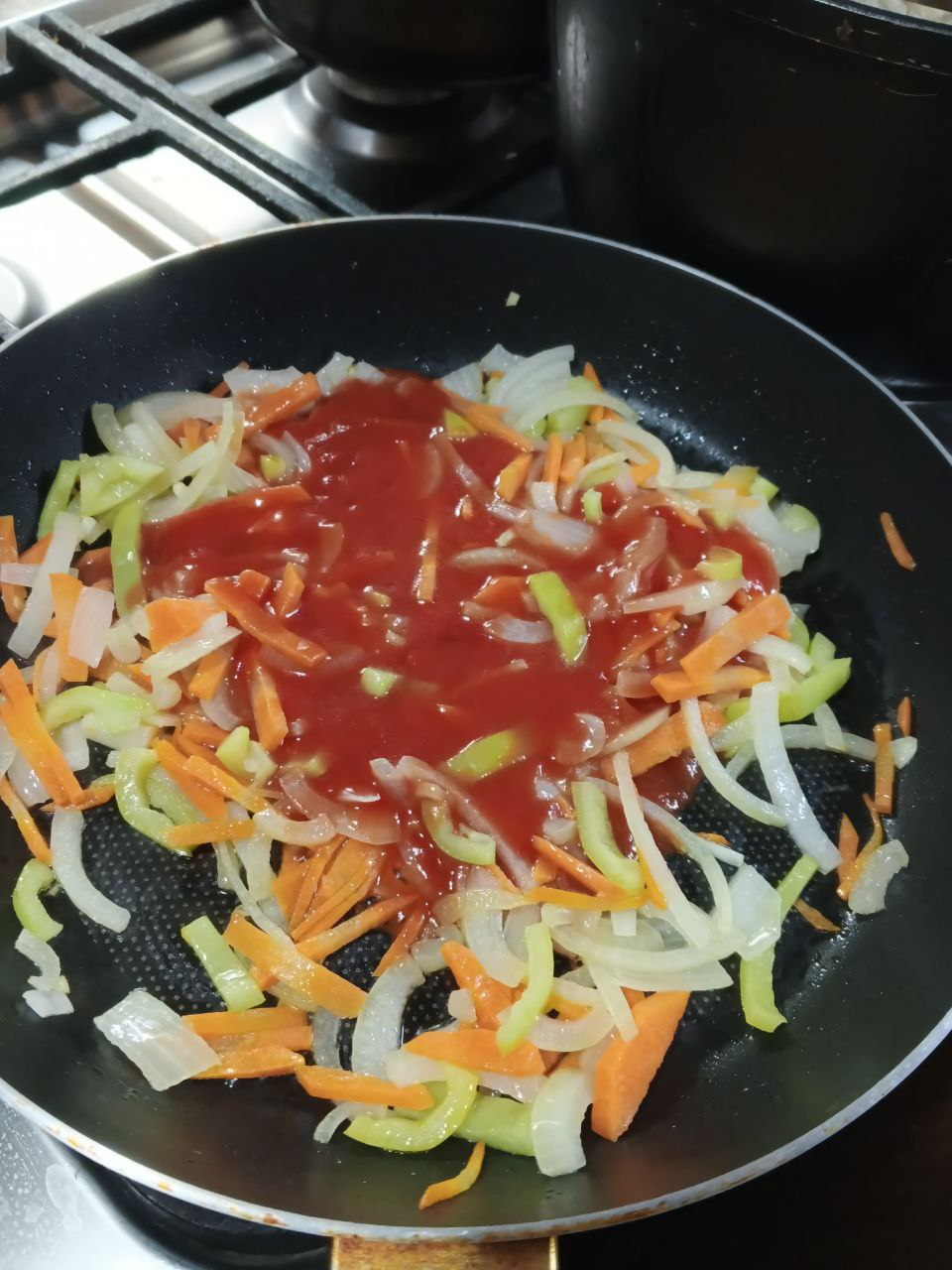 Добавляем томатную пасту и немного бульона, даём немного потушиться