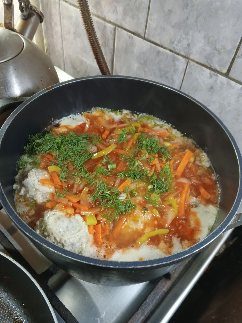 Когда тефтели сварились раскладываем по касушкам и заливаем бульоном - рекомендую добавить сметаны